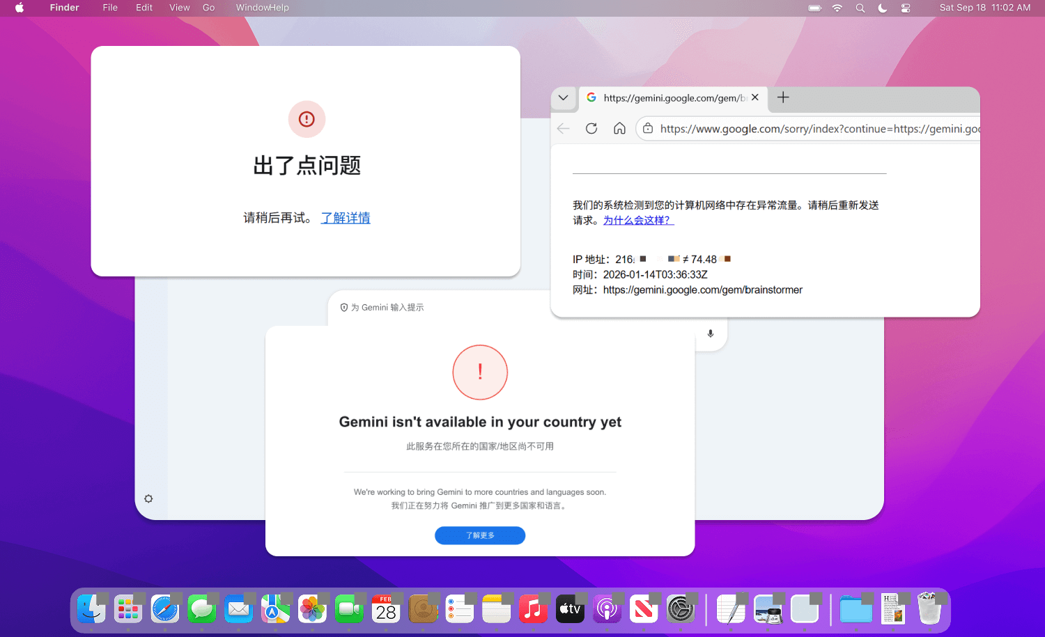 所以当你使用 VPN 时,其实就像是和很多人一起挤同一辆大巴车(共享同一个网络出口)去访问 Gemini。 如果某段时间,这辆车上用 Gemini 的人稍微多了一点,Google 的风控系统就会警觉:“不对劲,怎么同一个地方一下子冒出来这么多人?”